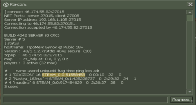- Написать в консоль команду status найти свой ник и скопировать все что после STEAM